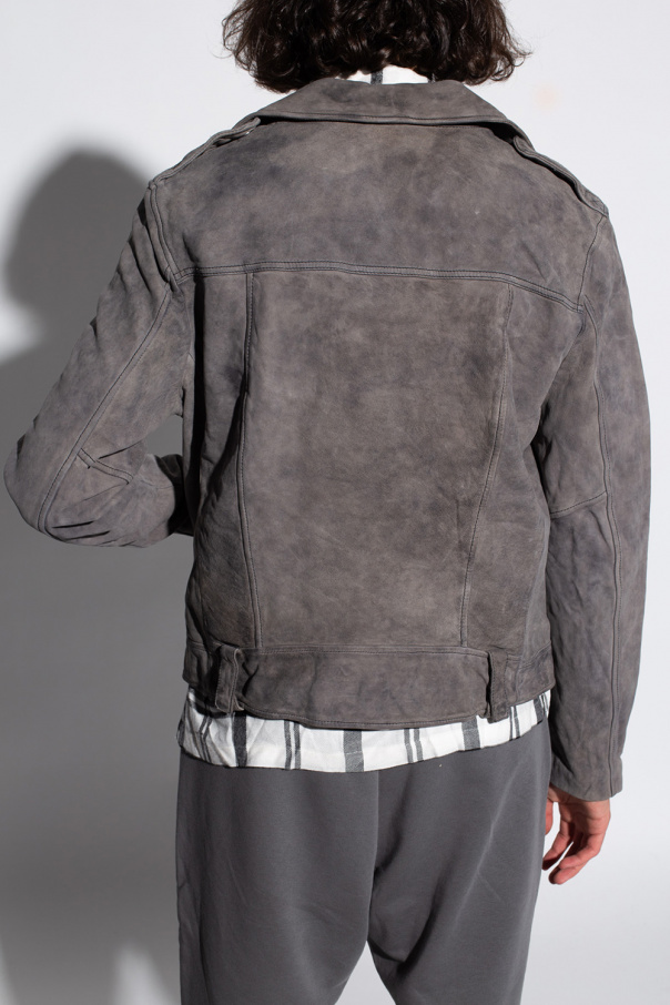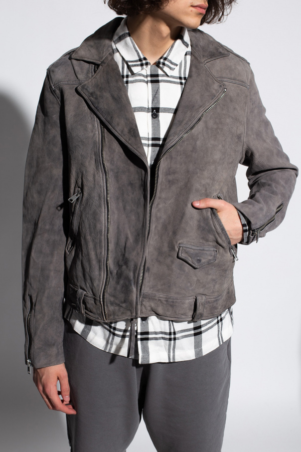 Grey ‘Antro’ jacket from AllSaints. Crafted from sheep leather, this style features a zip fastening, notch lapels and two zipped pockets.