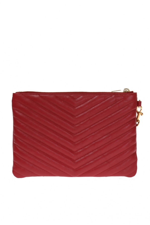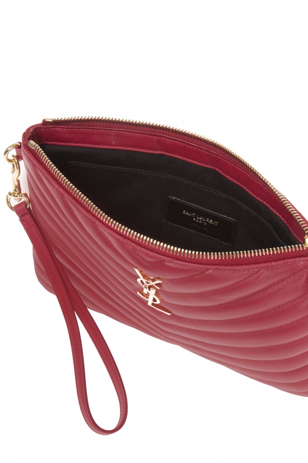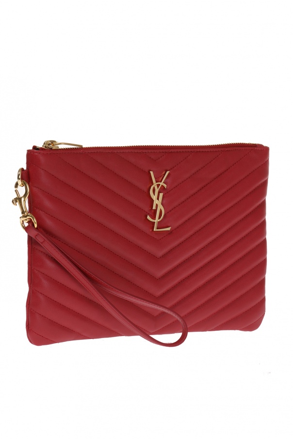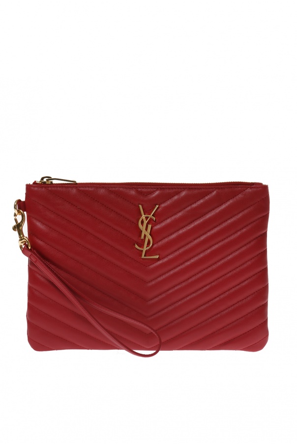 Red 'New Jolie' quilted clutch from Saint Laurent. Made of calf leather. Zip fastening. Metal logo on the front. Detachable wrist strap. Black interior with 1 slip pocket and 8 card slots. Gold-tone metal hardware.