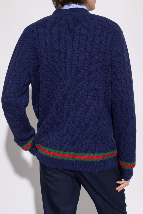 Navy cardigan from Gucci. Made of a cashmere and wool blend, this garment features button fastenings, two slip pockets and ribbed trims at the V-neck, hem and cuffs.