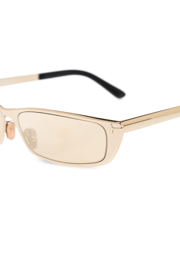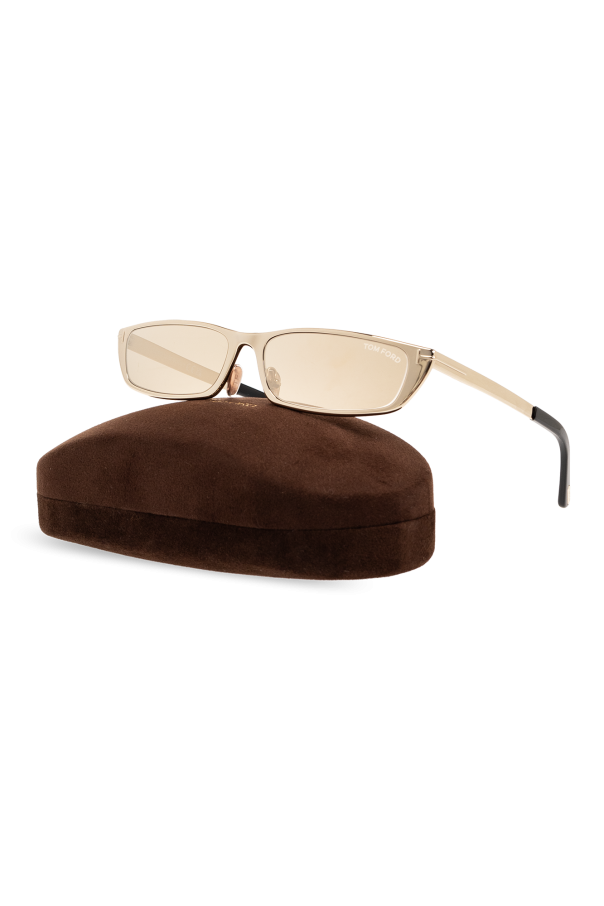 Gold-tone ‘Everett’ sunglasses from Tom Ford. This model features a narrow, rectangular framework and brown lenses with a gold-tone mirror effect and 100% UV protection. Case included.