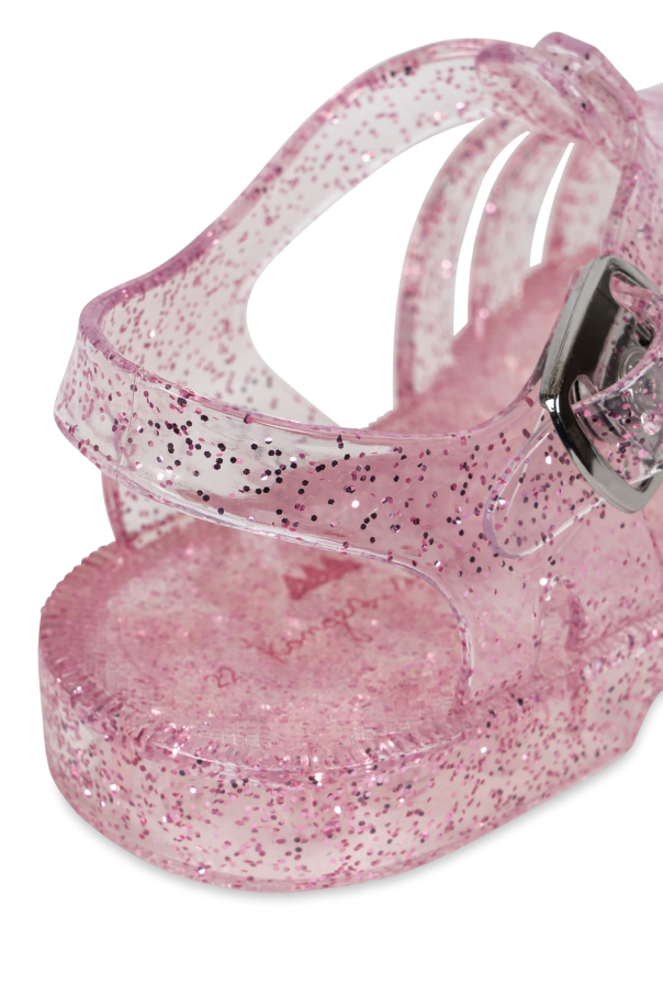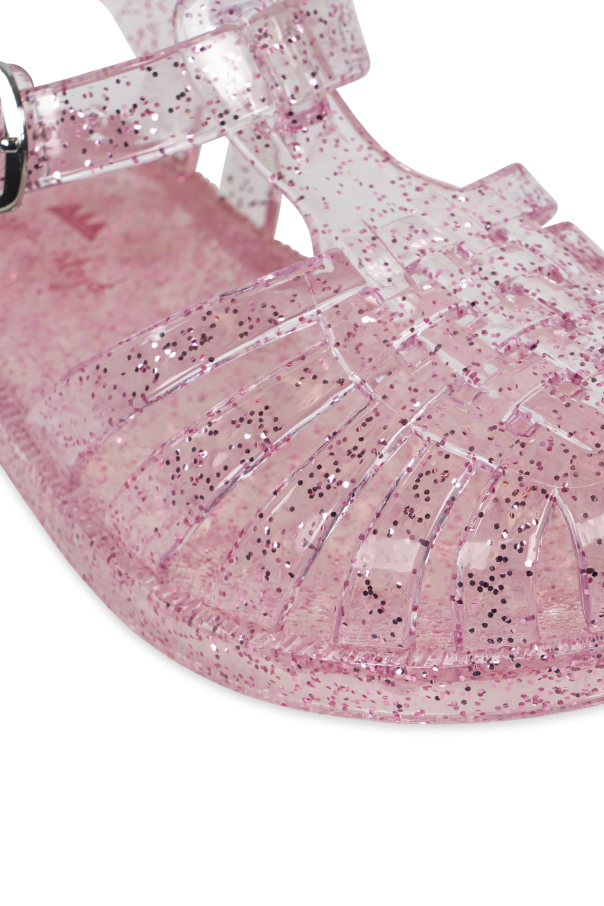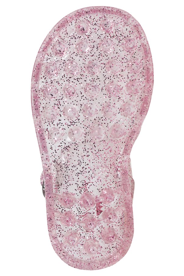 Introducing an enchanting addition to your child\'s summer wardrobe: Pink Glittery Rubber Sandals by Konges Sløjd. Crafted with the utmost care, these sandals are a testament to playful elegance and comfort. The transparent rubber material, infused with a rose hue and evenly scattered glitter particles, bestows a captivating shimmer, making every step sparkle. The design features a classic silhouette with strategic cutouts forming delicate straps at the front, complemented by an ankle strap with an adjustable buckle closure. This ensures a snug fit, adapting seamlessly to your child\'s foot. The flat sole, also made of rubber, is embossed with a pattern designed to enhance traction, promising stability and ease in every adventure. Accentuated with a metallic-looking buckle, these sandals incorporate a subtle contrast that elevates their overall allure. Despite the absence of a visible logo or designer name, the craftsmanship and aesthetic appeal hint at their exclusive lineage. Why Purchase This Product? Exceptional Quality: Meticulously crafted from 100% PVC, ensuring durability and comfort. Adjustable Fit: The buckle closure allows for personalized adjustment, accommodating growing feet. Unique Design: The rose-tinted, glitter-infused material paired with a metallic buckle adds a touch of whimsy and refinement. Enhanced Traction: Thoughtfully designed sole pattern increases grip, promoting safe and joyful play.