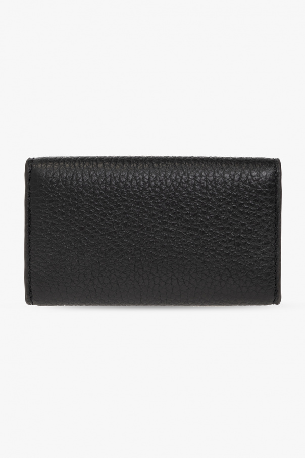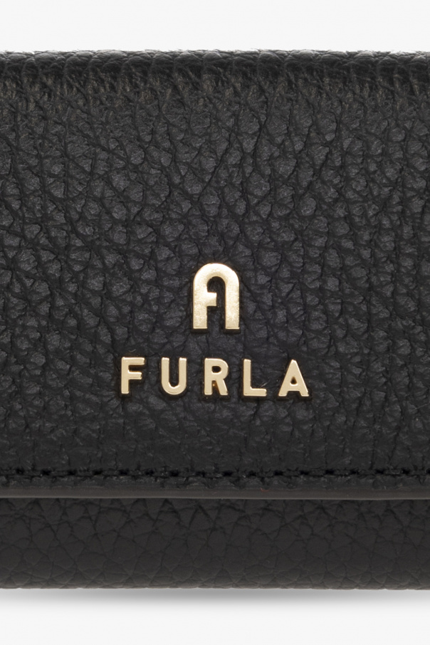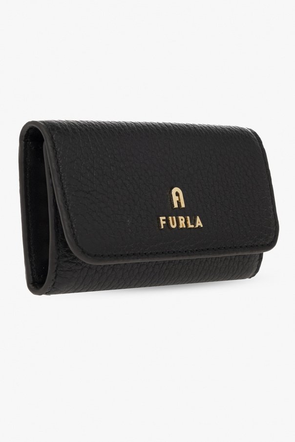 Black ‘Camelia’ key case from Furla. Made of leather, this item features a snap closure, metal logo appliqué and gold-tone metal hardware. It has one slip pocket, four key hooks and detachable key ring inside.