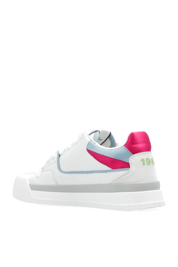 White ‘New Jersey’ platform sneakers from Dsquared2. Made from calf leather, this lace-up model sits on a white and grey rubber sole and showcases a raised logo print in green, colourful inserts and a suede insert with embroidered ‘1964’ on the back.