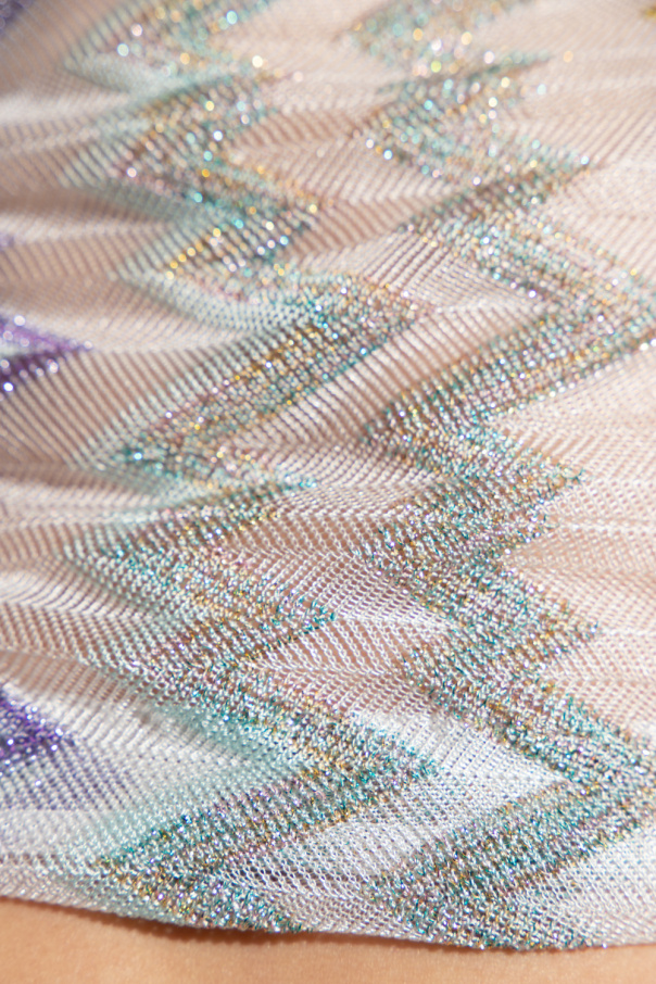 White, sheer, off-the-shoulder beach top from Missoni. Inlaid with lurex threads, this design features tie fastenings at the nape of the neck and the brand’s signature zig zag pattern.