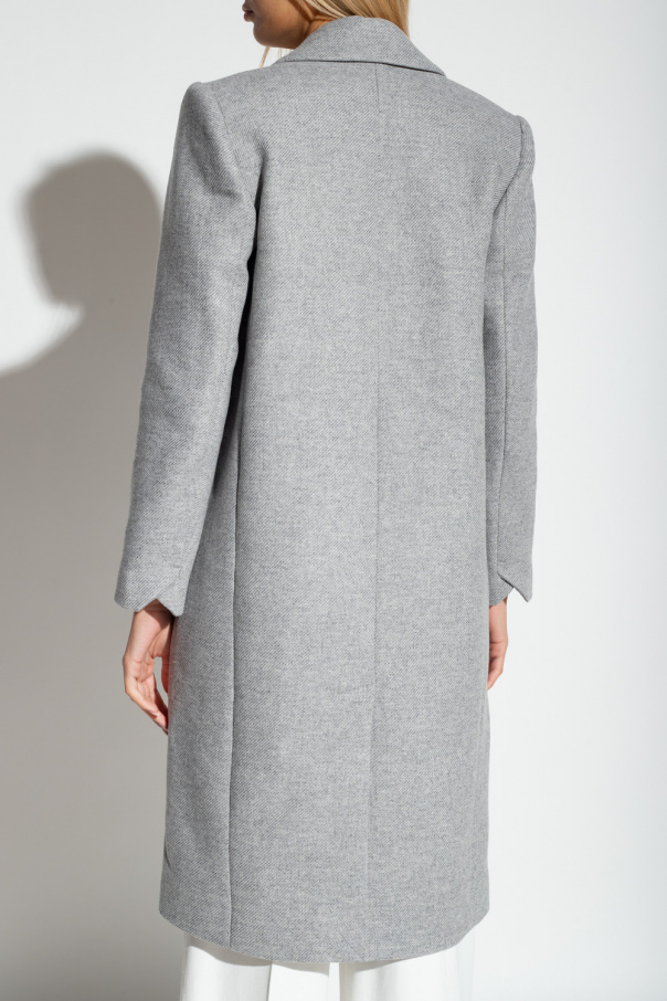 Grey ‘Monarque’ single-breasted coat from Zadig & Voltaire. Crafted from a wool blend, this style features a single button closure, peak lapels, distinctive tapes inlaid with glistening silver-tone thread on the front, two flapped pockets, long sleeves and a single back vent.