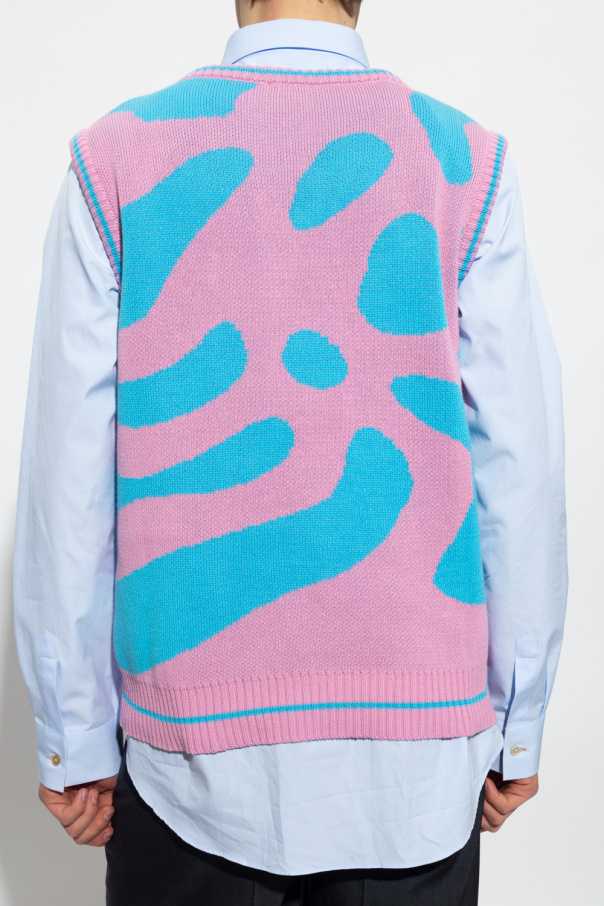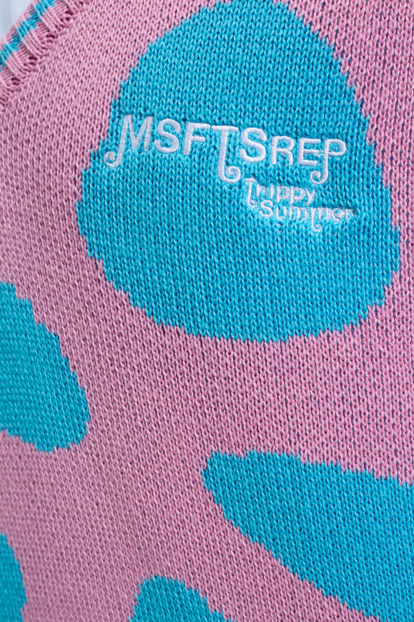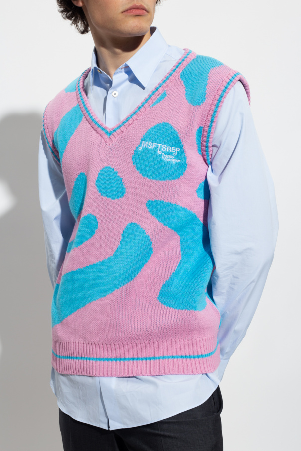 Pink and blue vest from MSFTSrep, the ‘Trippy Summer’ collection. Made of cotton, this garment features an oval pattern, white logo embroidery and striped ribbed trims at the V-neck, hem and cuffs.