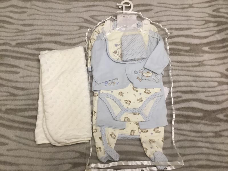 Продаётся новый (запечатанный) комплект для грудного ребёнка в возрасте 2-6 месяцев. Бренд - Sterling baby. Состав - 100% хлопок высшего качества. В комплект входит 7 вещей : шапочка, слюнявчик, кофточка на кнопках, песочник, штанишки, ползунки на кнопках, пеленка. Плюс одеяльце (70см на 74см) в подарок. Все новое, выглядит прекрасно.