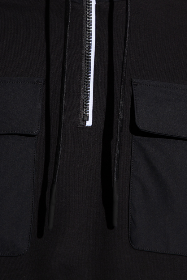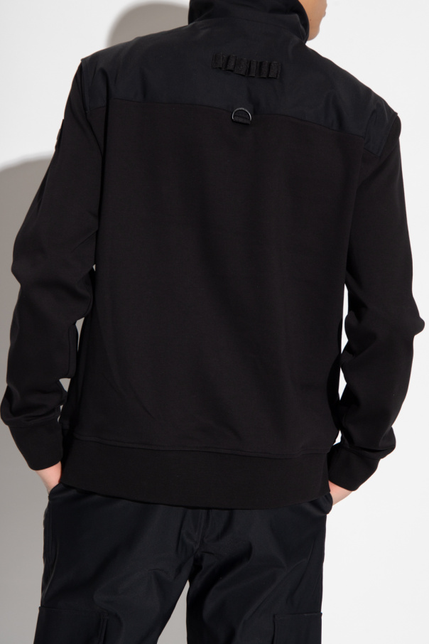 Black sweatshirt from Moose Knuckles. Crafted from cotton, this style features a standing collar with a zip closure and drawstrings, two flapped pockets and two zip pockets on the front, a branded sleeve appliqué and elasticized trims on the edges.