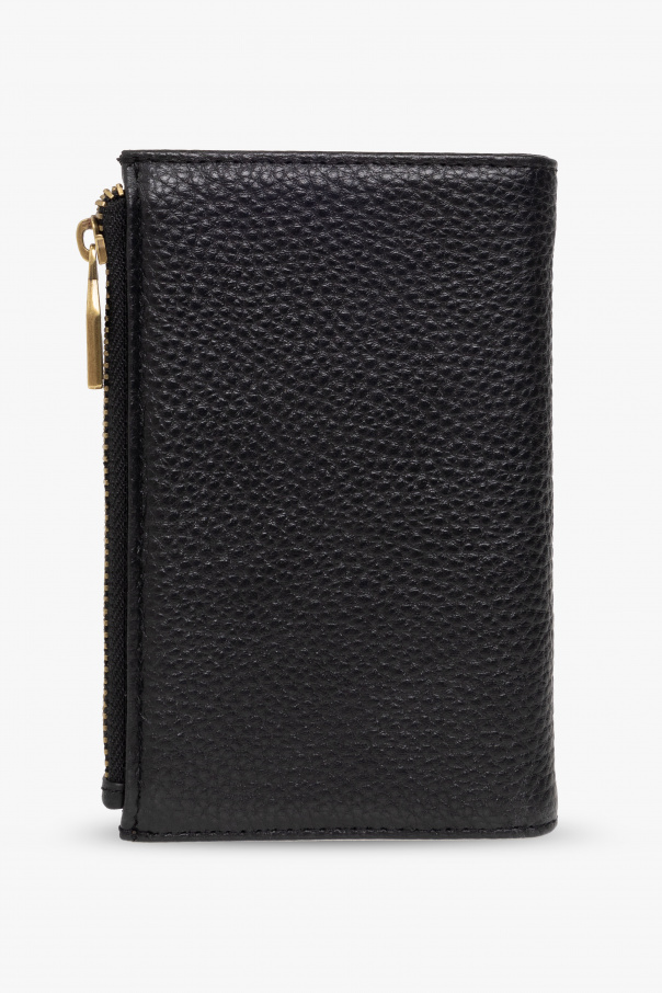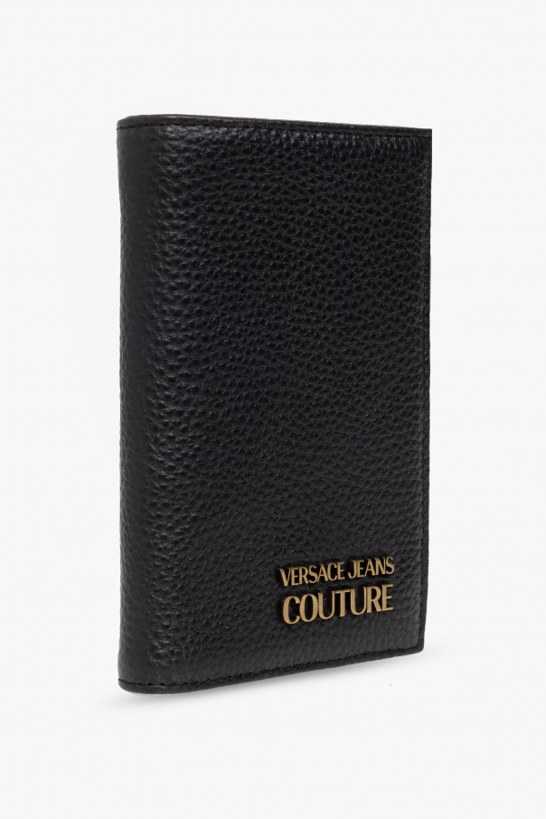 Black bifold wallet from Versace Jeans Couture. Crafted from grained bovine leather, this item features a metal logo appliqué, zipped coin pocket and antique gold-tone metal hardware. It has a bill compartment, two slip pockets and eight card slots inside.