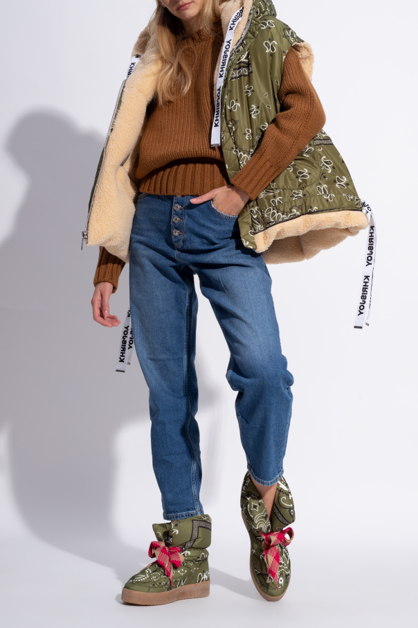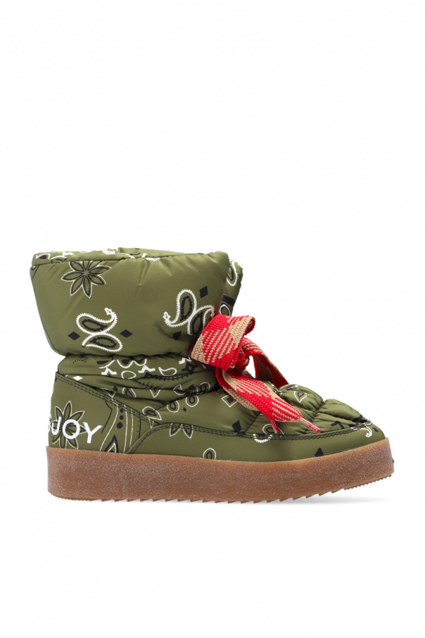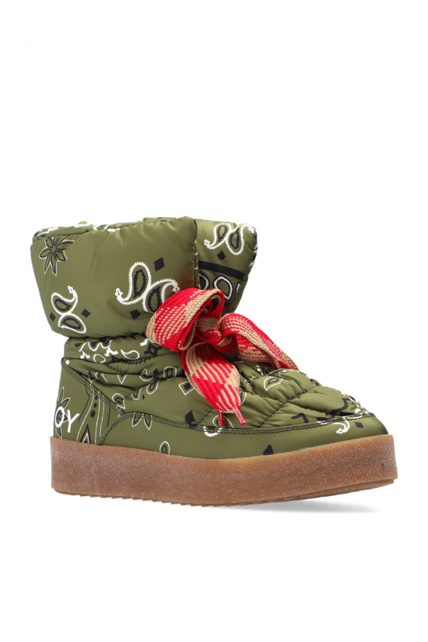 Green, black and white snow boots from Khrisjoy. Embellished with a paisley motif, this lace-up model features a white logo print and a brown rubber sole.