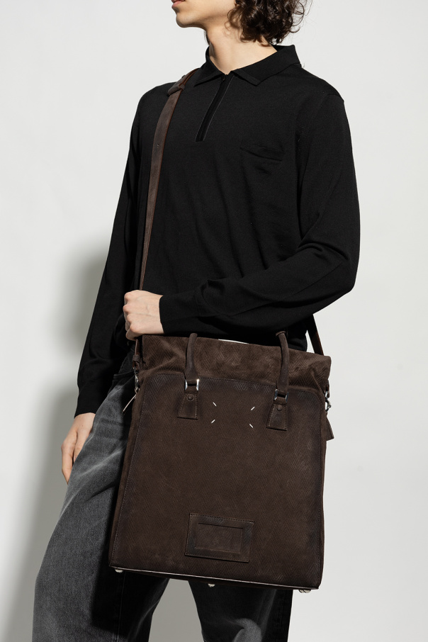 Brown ‘5AC’ backpack with a vintage effect from Maison Margiela. Made of calf suede embossed with a logo, this model features a flap with a white patch with a numerical logo, the brand’s signature seam and belt loop in white, two half-round handles with snap-fastened straps, detachable and adjustable strap that can be worn as two shoulder straps, silver-tone metal hardware and one internal compartment with one slip pocket.