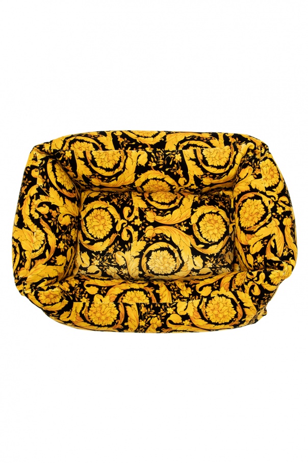 Black dog bed from Versace Home. Crafted from cotton, this item features a gold-tone baroque print and comes with a pillow.