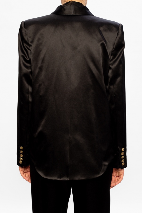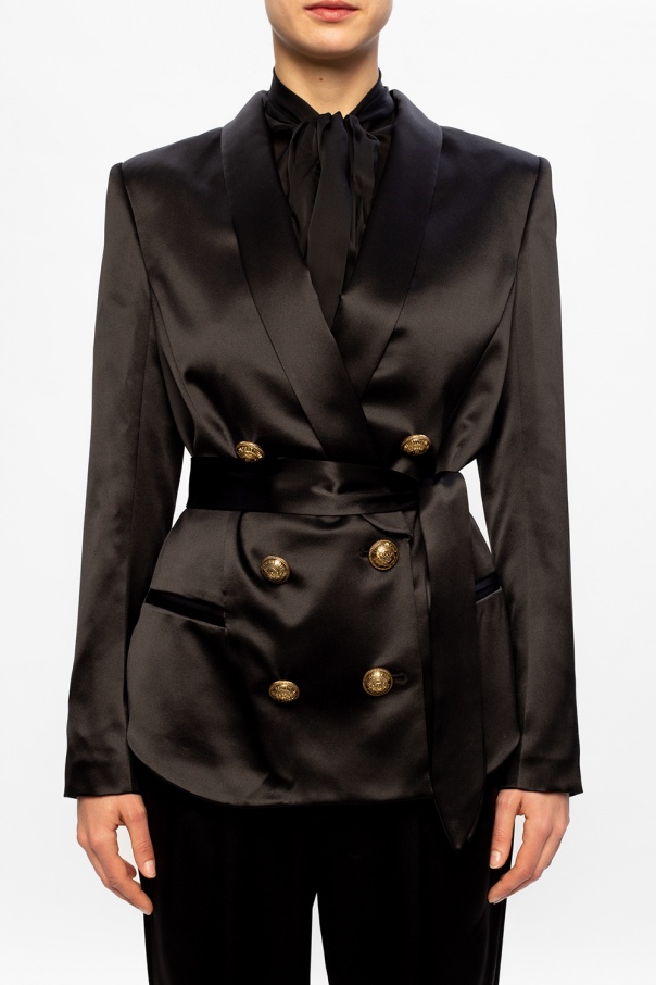 Black double-breasted blazer from Balmain. Made of silk. Fastened with logo-embossed buttons in gold-tone. Long sleeves. Two slip pockets on the front. Comes with a belt.