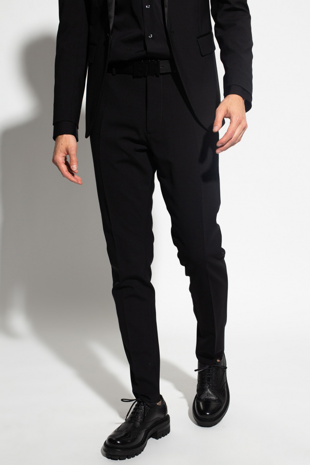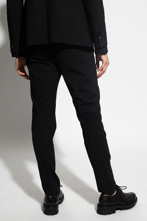 Black pleat-front trousers from Dsquared2. Made of wool, this pair falls down with tapered legs and features button and hook fastenings, a metal logo appliqué in silver-tone, two front pockets and two buttoned back pockets.