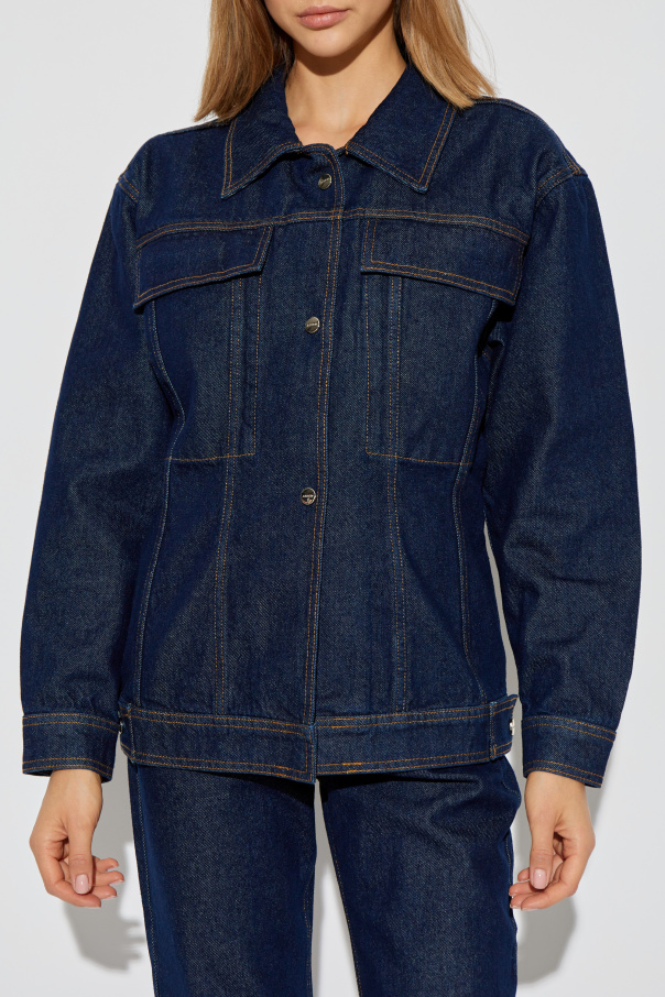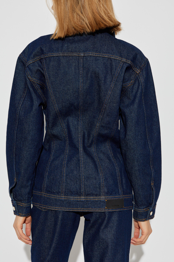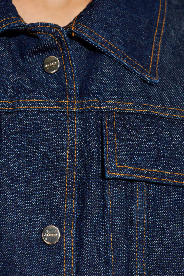Introducing the Roisin Denim Jacket from the exclusive collection by Aeron. This exquisite jacket epitomizes timeless elegance with its classic, straight cut and long sleeves. Crafted from deep, navy-blue denim, it is a testament to fine craftsmanship and luxurious material. The Roisin features a button-down front with five metal buttons, inscribed with \"A.P.C.\" - a subtle nod to its distinguished designer. The jacket’s design is accentuated by prominent, contrasting stitches that add a touch of sophistication. The front is adorned with two large flap pockets, also fastened with buttons, providing both functionality and style. The slightly fitted silhouette, with a subtle taper at the waist and gentle flare at the hips, ensures a flattering shape. The sleeves conclude with adjustable buttoned cuffs, allowing for a tailored fit. This jacket is a perfect blend of classic and contemporary, making it a versatile addition to any wardrobe. Why Choose This Product? Timeless Design: Classic cut with modern detailing. Premium Material: Made from 100% high-quality cotton denim. Distinctive Details: Contrasting stitches and designer-inscribed buttons. Functional Elegance: Two large buttoned flap pockets. Versatile Fit: Slightly tailored with adjustable cuffs.