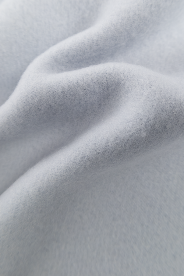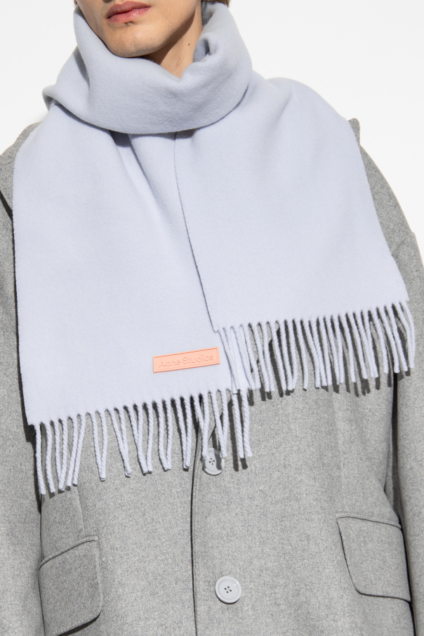 Light blue scarf from Acne Studios. Made of RWS-certified wool, this item showcases a pink logo patch and fringed edges.