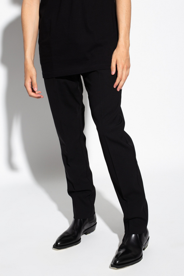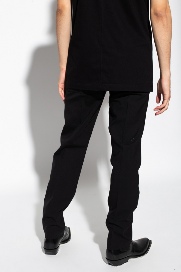 Black trousers from Rick Owens. Cut from wool with a dropped crotch, this pair features a drawstring waist, two slip pockets on the front and two snap-fastened flapped pockets on the back.