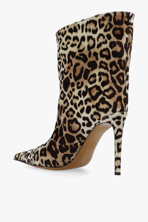 Beige and black ‘Alex’ heeled ankle boots from Alexandre Vauthier. Crafted from velour, this model showcases a slip-on silhouette with an animal pattern, a tapered toe and a beige leather sole.