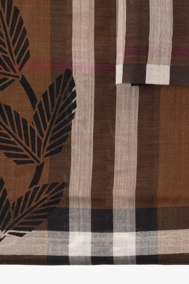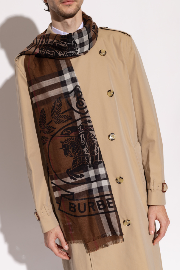 Brown scarf from Burberry. Made of a wool and silk blend, this design features the raw cut edges, Equestrian Knight Exaggerated Check, black Equestrian Knight Design and oak leaf crest – a modern take on Burberry’s archive emblem.