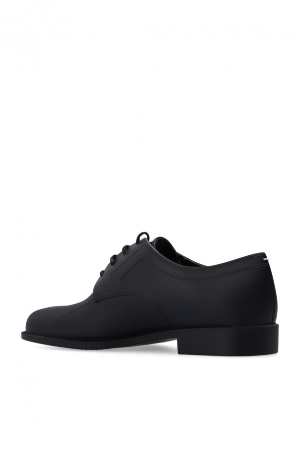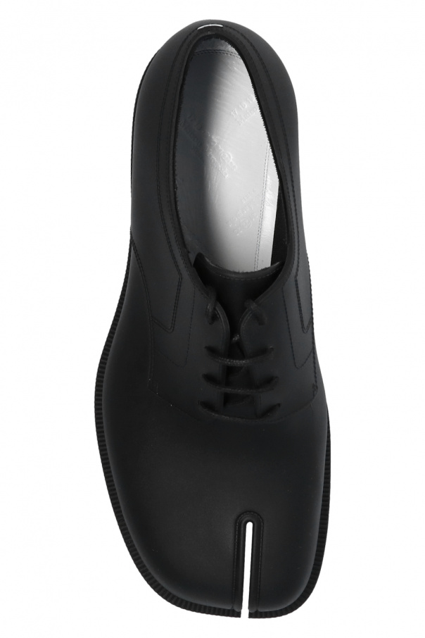 Black shoes from Maison Margiela. Resting on a black rubber sole, this lace-up pair features decorative stitching details and the label’s signature ‘Tabi’ toe.