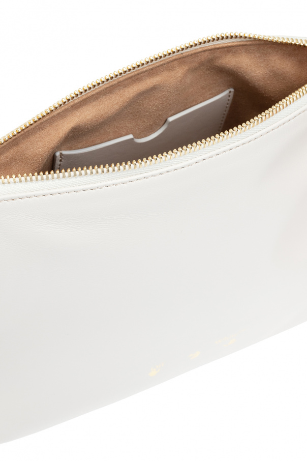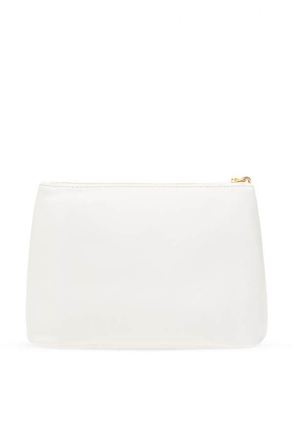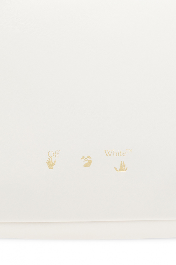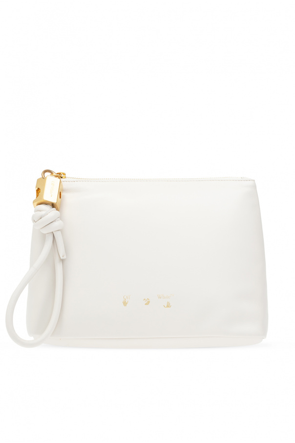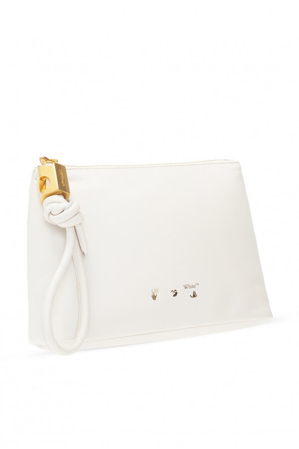 Cream hand bag from Off-White. Crafted from calf leather, this design features a zip fastening, wrist strap, gold-tone logo print, gold-tone metal hardware and one internal compartment with one card slot.
