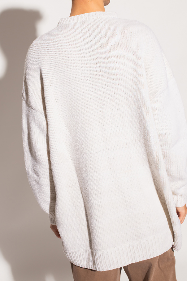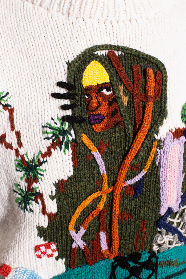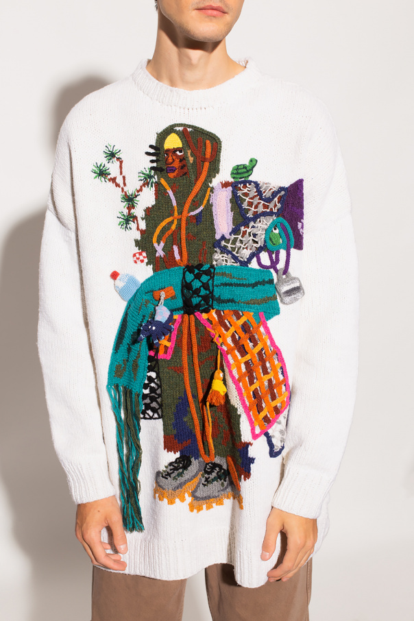 Cream sweater from Loewe, the ‘Eye/Loewe/Nature’ collection. Made of wool, this garment features a multicolored appliqué with raised elements, fringes, a round neck and ribbed trims.