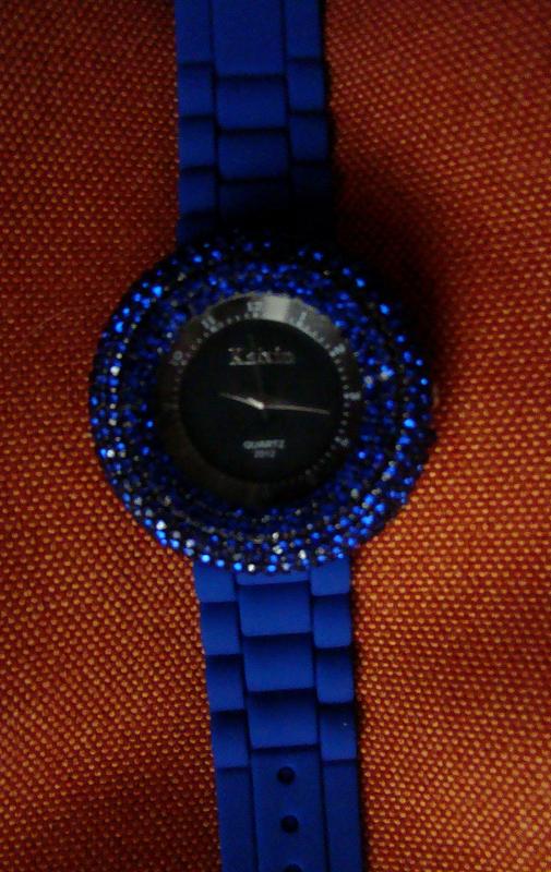 В очень хорошем состоянии,в реале намного ярче,все стразы на месте,силиконовый браслет в новом состоянии,большой объемный циферблат со множеством стразов,единственное - надо заменить батарейку(т.к.длительное время не носились)