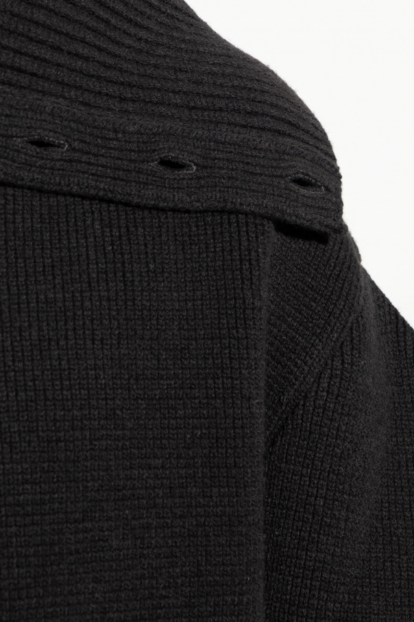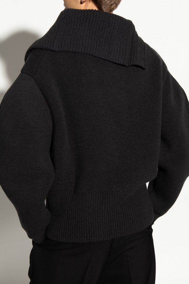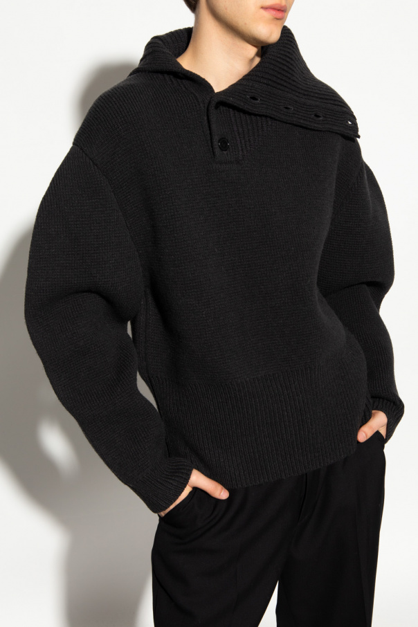 Dark grey turtleneck sweater from Bottega Veneta. Crafted from wool with a relaxed fit, this style features a button placket and ribbed edges.
