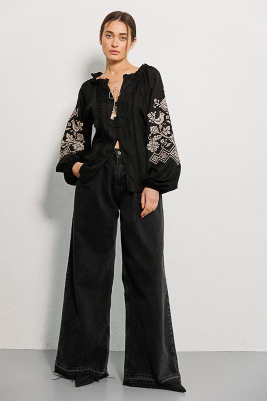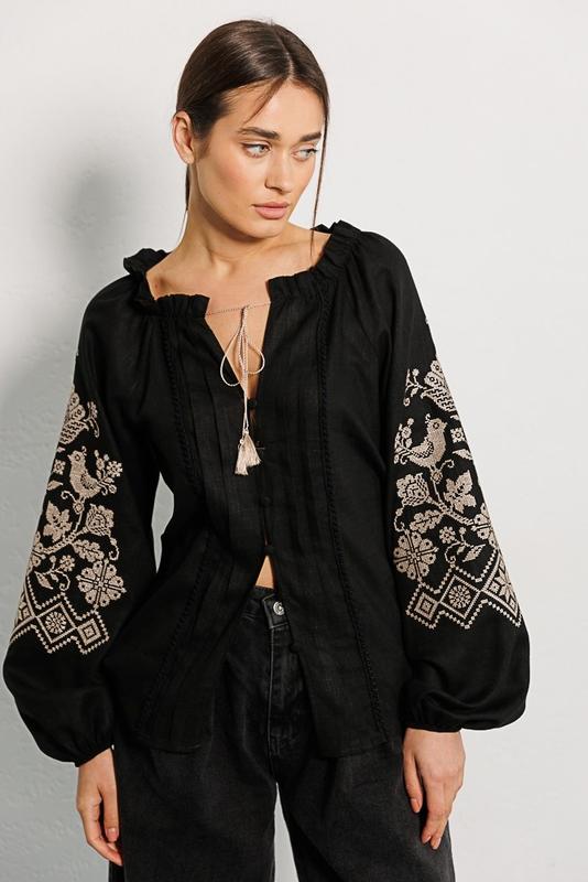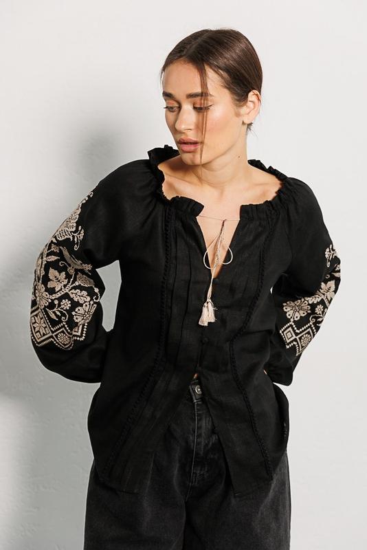 На модели размер S❤️Эта черная вышиванка с узорами в бежевых тонах подружит не только с одеждой базовых расцветок, но и с яркими модными вещами. Ты будешь в восторге от ее универсальности.