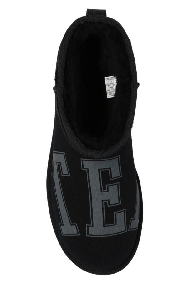 Black boots from UGG x Telfar. Made of sheep wool and finished with GGPlush™ wool-blend, this model features a slip-on silhouette, grey logo cracked prints, a logo appliqué on the back and a textured sole in black EVA.