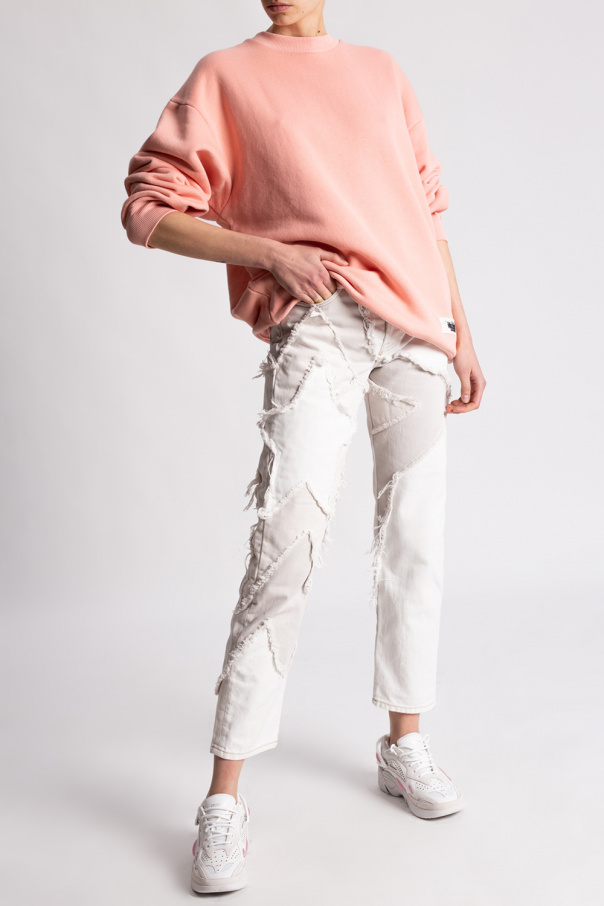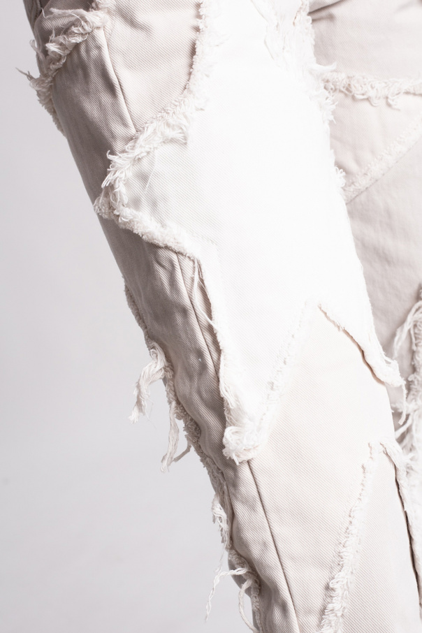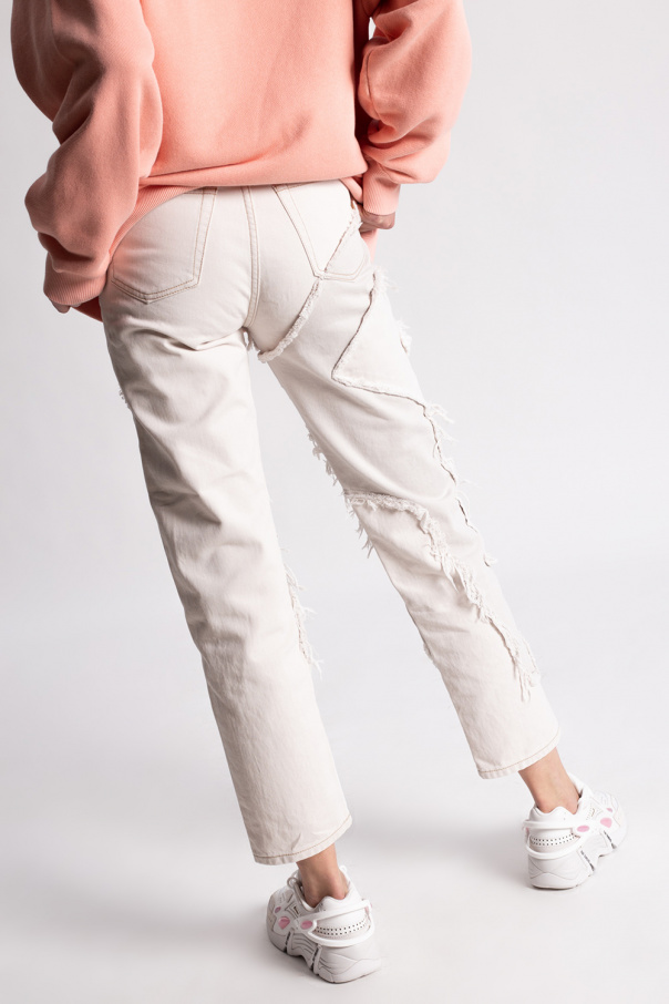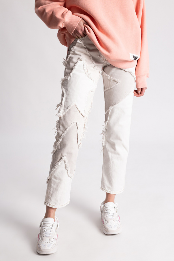Beige and cream jeans from Acne Studios. Made of cotton, this pair falls down with tapered legs and is complete with button fastenings, five slip pockets, logo-embossed white patch at the back and an embroidered star motif.