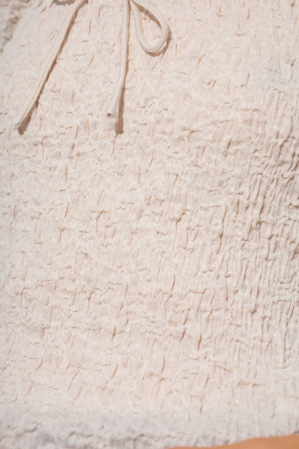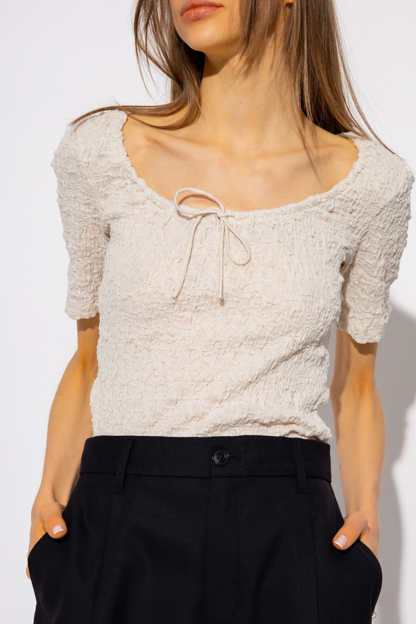 Cream ‘Johanna’ top from Samsoe Samsoe. Made of textured elastic fabric, this short sleeve design features a round neck with drawstrings.