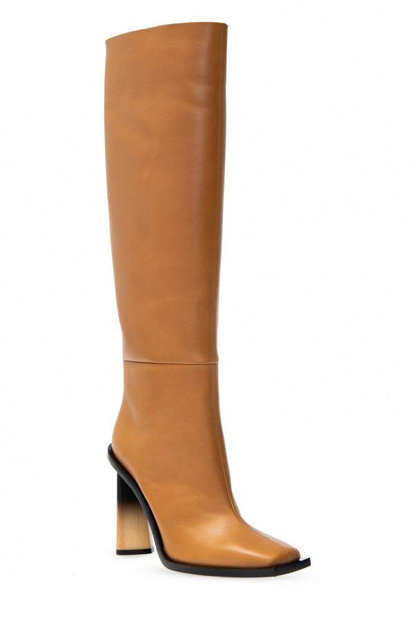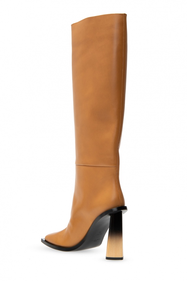 Light brown ‘Losange’ boots from Givenchy. Crafted from calf leather, this style features a square toe, an asymmetrical, shaded, beige and black heel and a black leather sole.