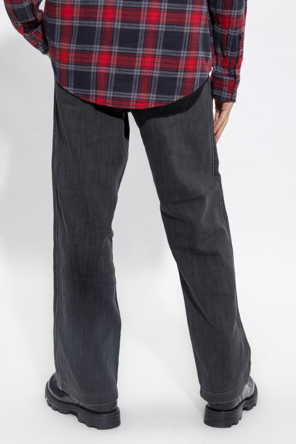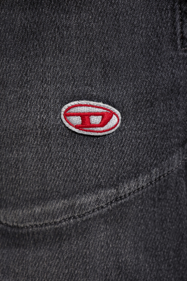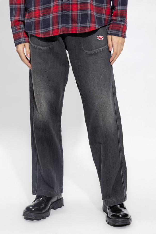 Dark grey ‘D-MARTIANS-NE’ distressed jeans from Diesel. Made of cotton, this pair features an elastic drawstring waist, wide legs and logo patch in red and white.