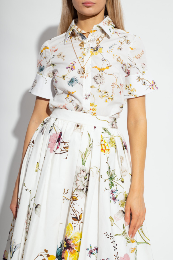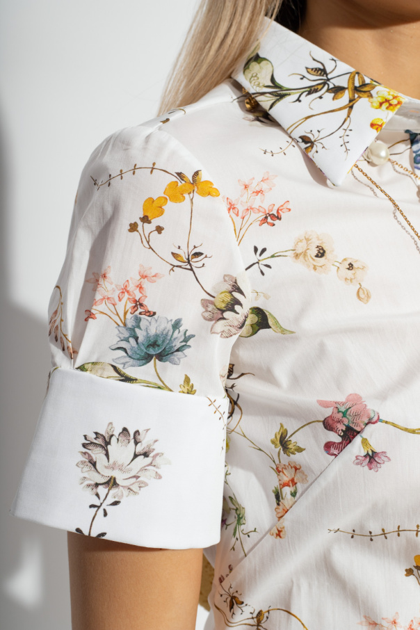 White ‘Ainsley’ shirt from Erdem. Made of cotton poplin, this design features button fastenings, a multicolored Laurenson Vine floral pattern and short sleeves with buttoned cuffs.