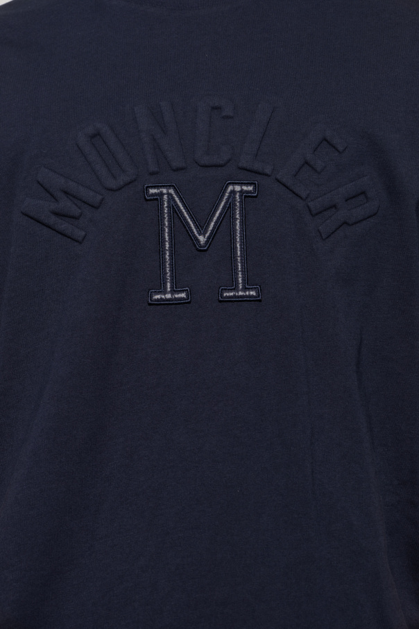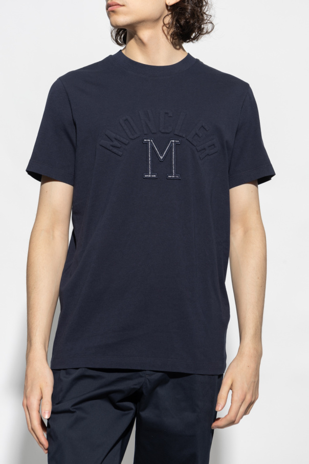 Navy blue crewneck T-shirt from Moncler. Crafted from cotton, this style features short sleeves, tactile branding on the front and short sleeves – one has a logo patch.
