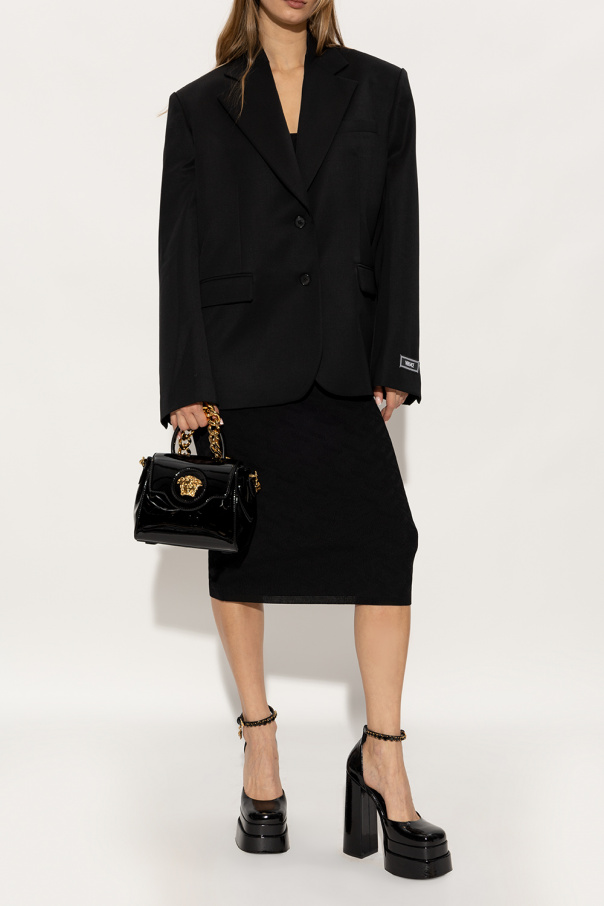Black ‘Medusa Aevitas’ platform pumps from Versace. Made of patent leather. Resting on a black leather sole, this pair features a buckled ankle strap embellished with black crystals and the brand’s signature Medusa head.