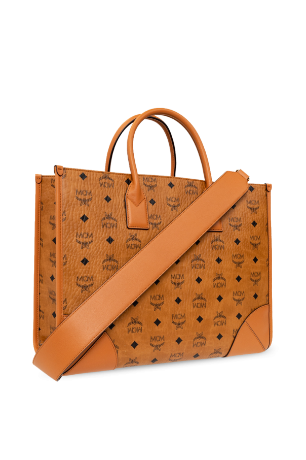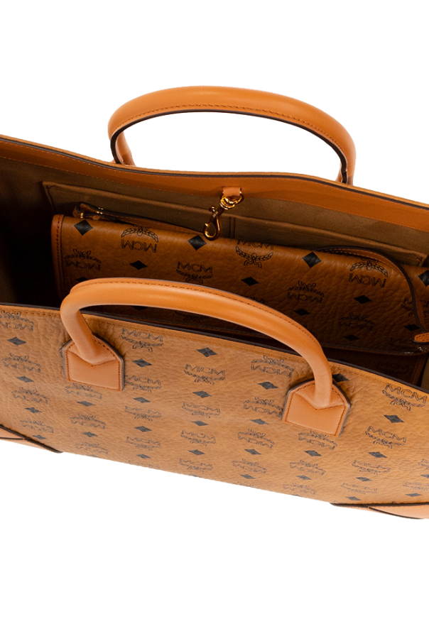 Brown ‘München Large’ shopper bag from MCM. Crafted from canvas printed with a black monogram, this design secures with a lobster clasp fastening and features leather trims, two half-round handles, a detachable strap, gold-tone metal hardware and one internal compartment with one zip pocket, two slip pockets and a detachable pouch with a snap closure.