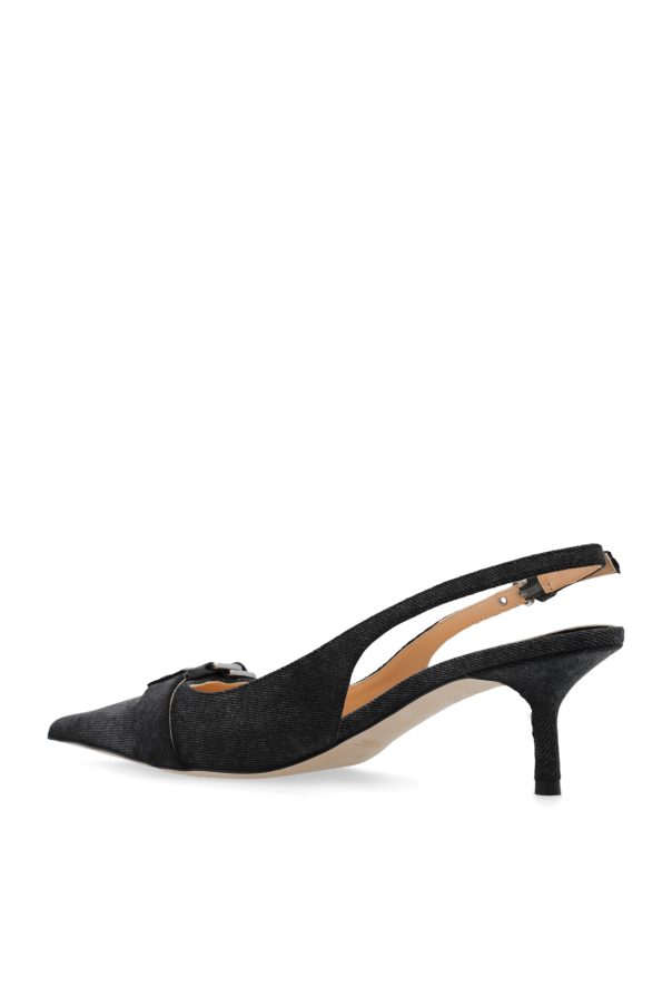 Black ‘Jeannie’ denim pumps from Blumarine. Fastened with an adjustable strap at the back, this pair sits on a beige leather sole and has a pointed toe with a strap and silver-tone buckle.