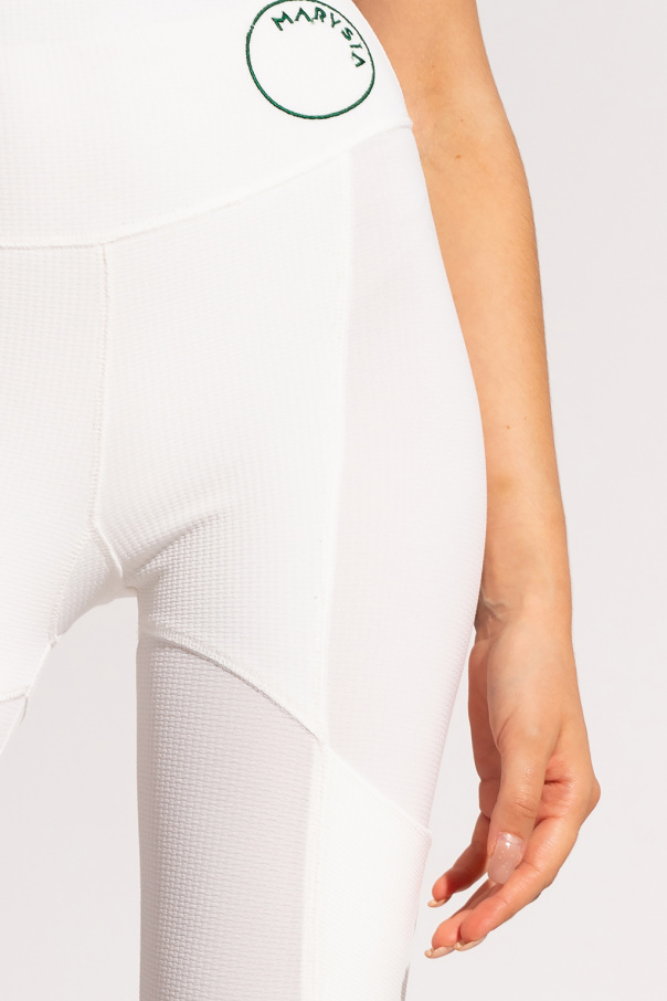 White leggings from Marysia. Crafted from recycled materials, they feature an elasticated waistband, hand-cut scalloped edges and an embroidered green logo.