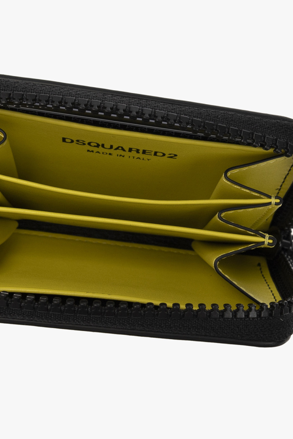 Yellow wallet from Dsquared2. Crafted from leather, this design fastens with a zip and features a black metal logo plaque on the front, a detachable strap on the side and three compartments and two slip pockets inside.