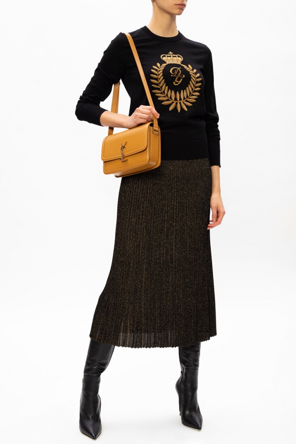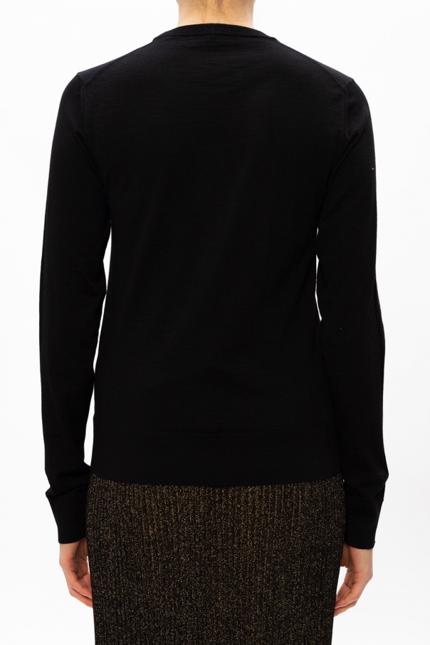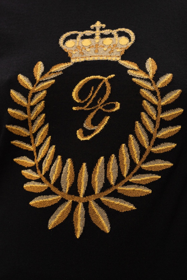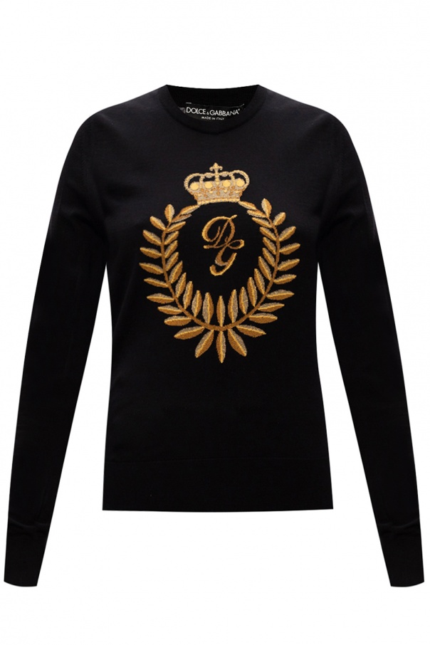 Black crewneck sweater from Dolce & Gabbana. Crafted from wool in a rib-knit design, this jumper showcases an embroidered antique gold-tone logo appliqué and is complete with elasticized trims.