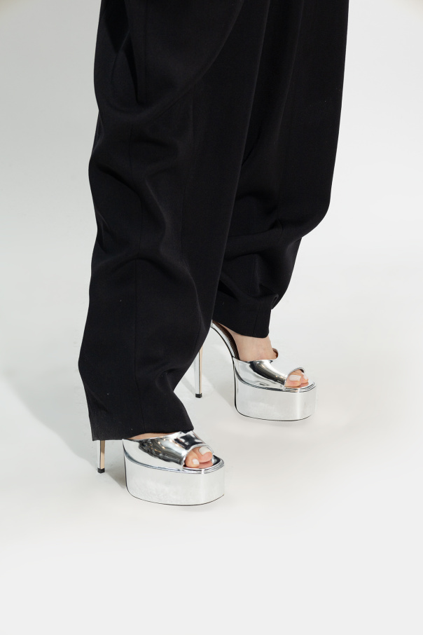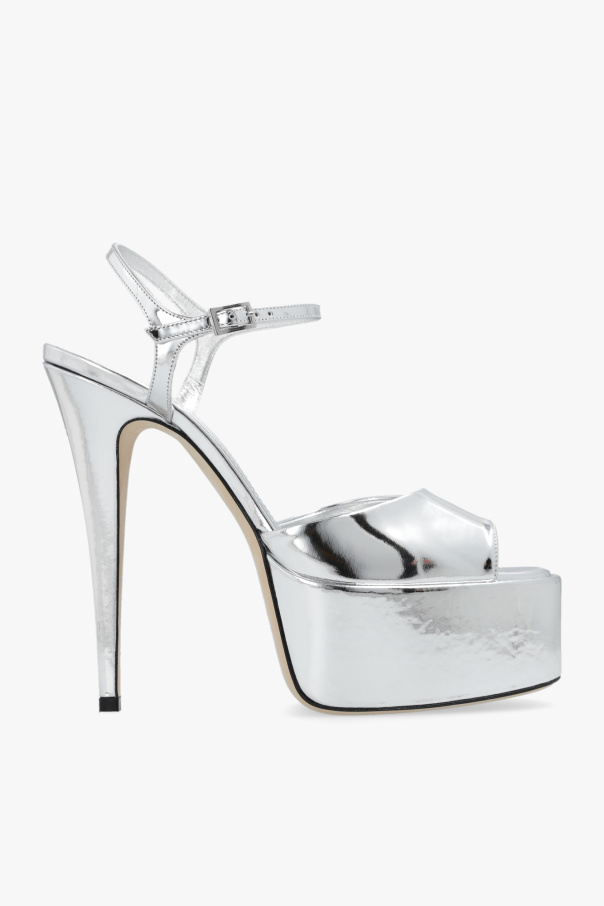 Silver-tone ‘Pamela’ platform sandals from Paris Texas. Made of leather with a mirror effect, this pair features an adjustable buckled ankle strap and cream leather sole.