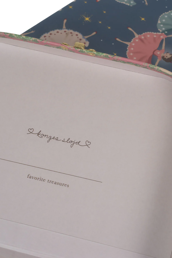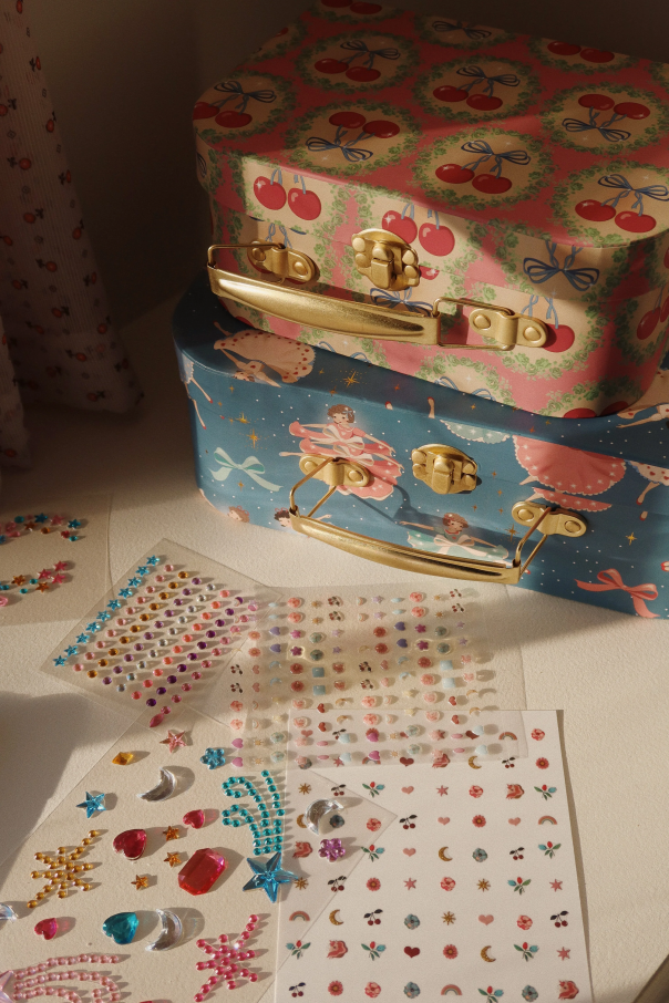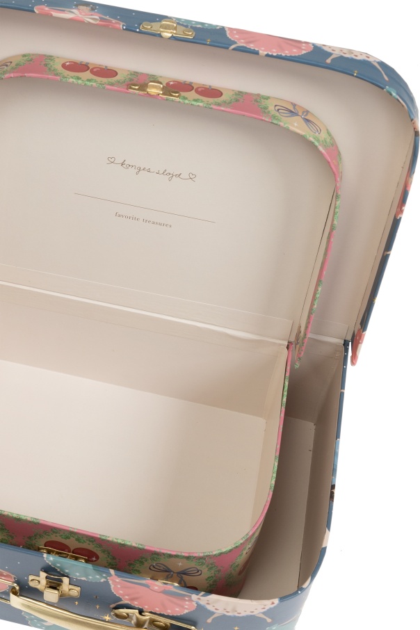 Introducing the Decorative Suitcase Set by the Danish brand Konges Sløjd, an epitome of aesthetic elegance and practical utility. This exquisite assortment of two suitcases, each with a distinctive design, brings a whimsical charm to any child\'s room. The suitcases boast a rectangular shape with gracefully rounded edges. One showcases a delightful pattern of ballerinas on a serene blue backdrop, while the other features charming cherries on a pink canvas, framed by ornate green details. Crafted from metal and paper, these suitcases are adorned with lustrous golden metal handles and clasps. The interior is illuminated with the brand\'s signature logo print, accompanied by the endearing phrases \"konges sløjd\" and \"favorite treasures\". The vibrant palette of pink, blue, red, and golden accents enhances their visual appeal. Why Choose This Product? Designed by the renowned Konges Sløjd, known for its sustainable practices. Made from FSC™ certified and controlled materials. Perfect for both storage and decoration. Features unique, playful prints that spark imagination.