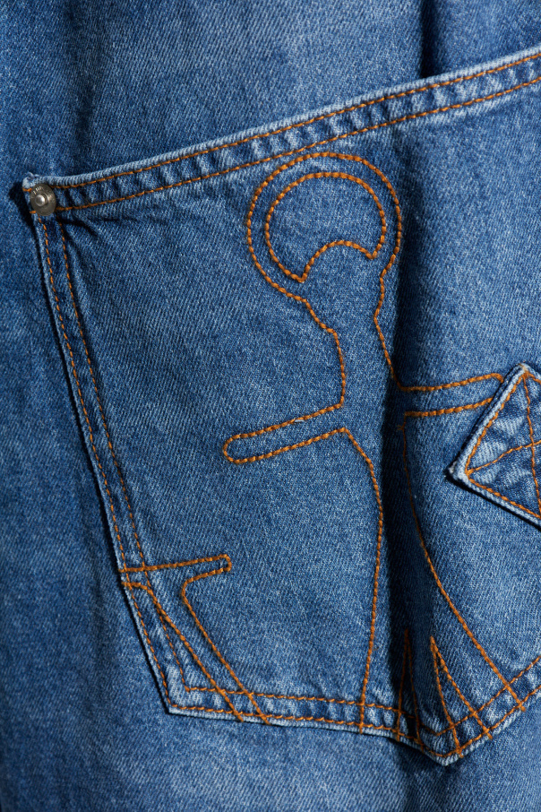 Blue denim shorts from JW Anderson. Embellished with an embroidered logo, patch and asymmetrical stitching details, this pair features a zip fly with a button, wide legs with frayed cuffs as well as three slip pockets – one is embroidered with a monogram.