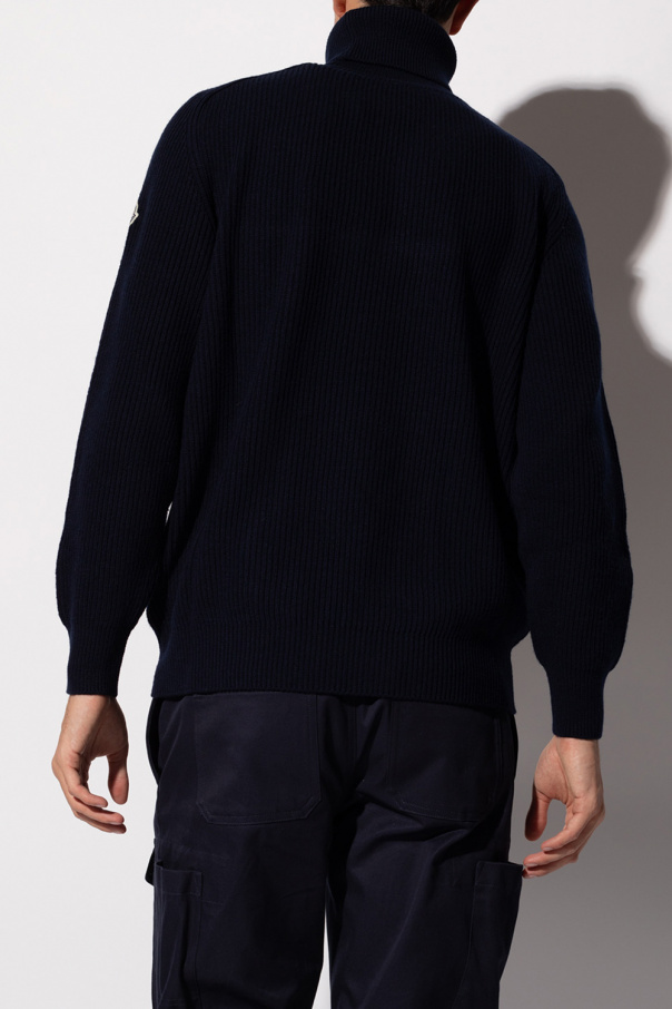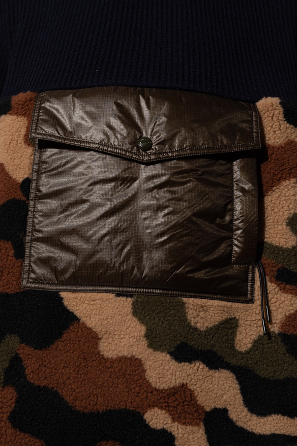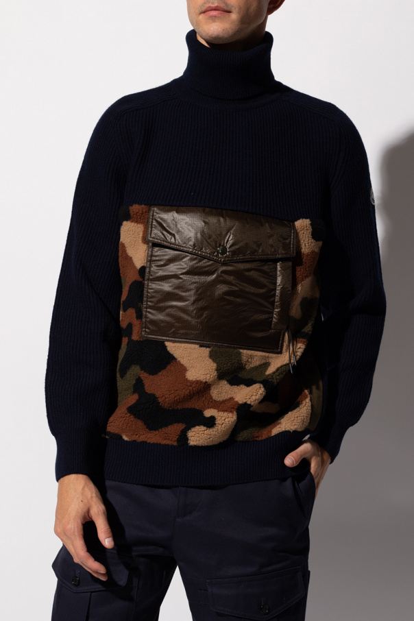 Navy turtleneck sweater from Moncler. Decorated with a camo pattern, this design features a snap-fastened flap pocket and one zip pocket.