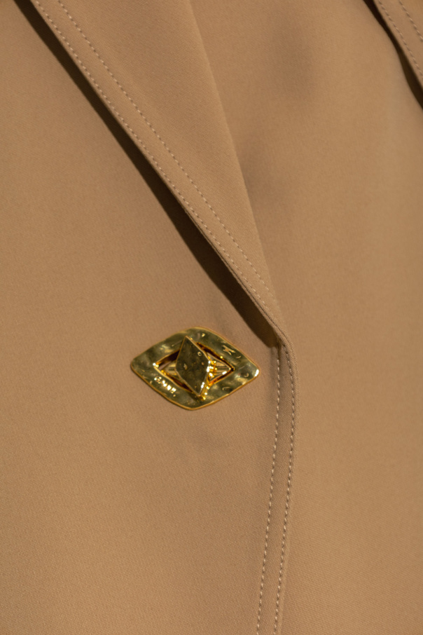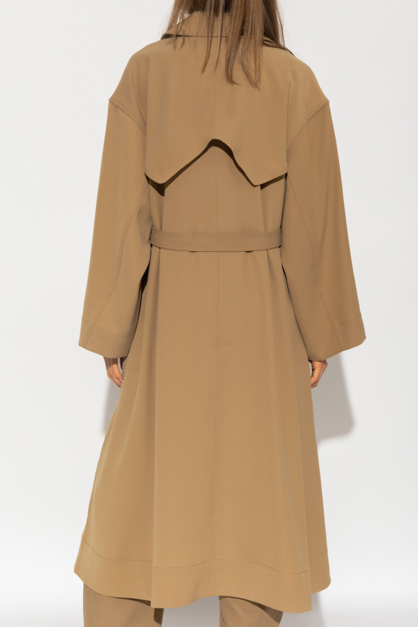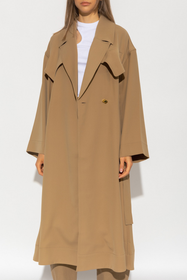 Beige coat from Ganni. Made in part from recycled materials, this design features button fastenings, decorative twist closure in gold-tone, tie waist, oversized collar, storm flap, two slip pockets and loose-fitting sleeves.