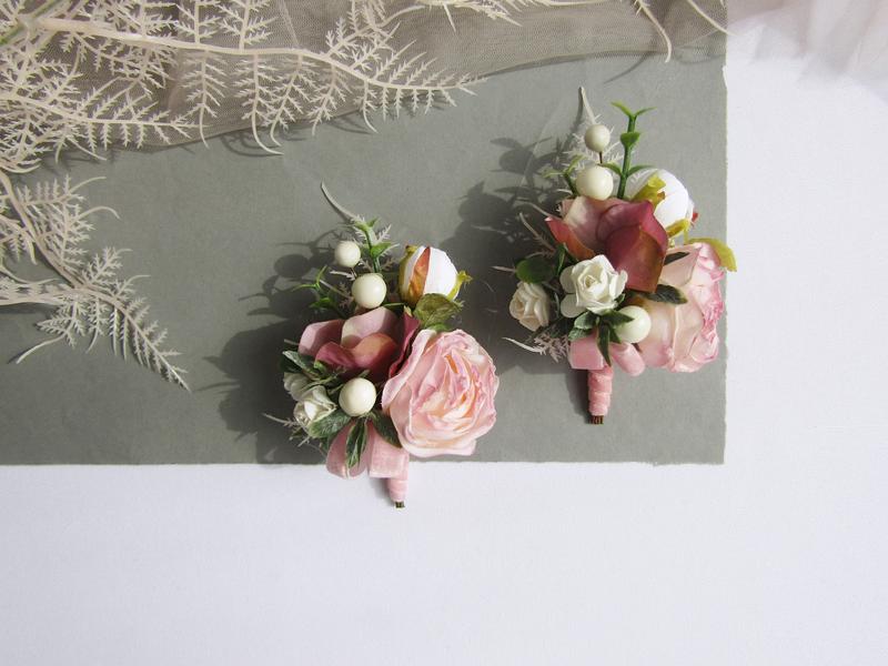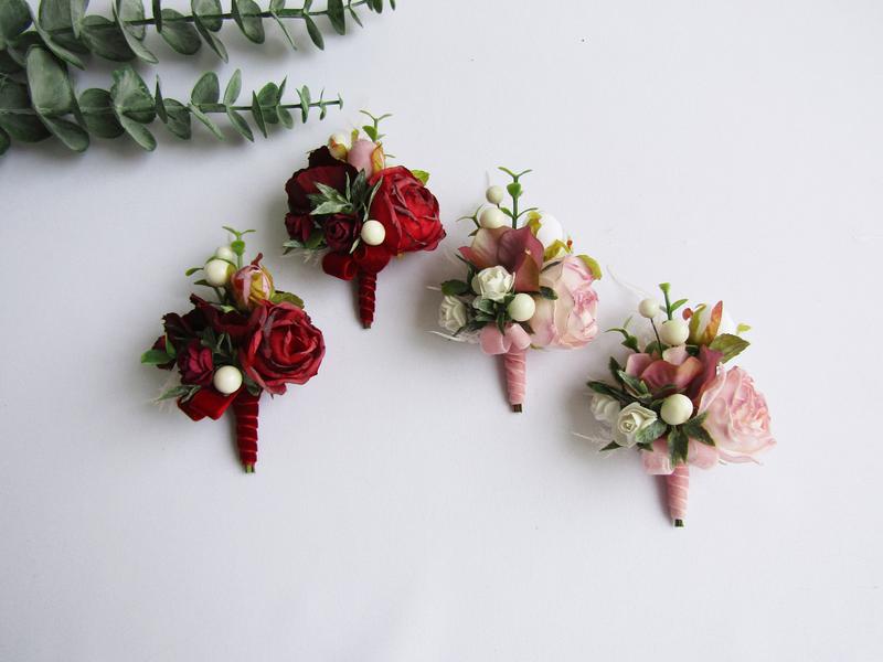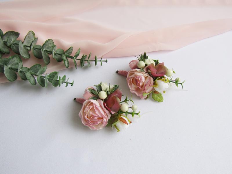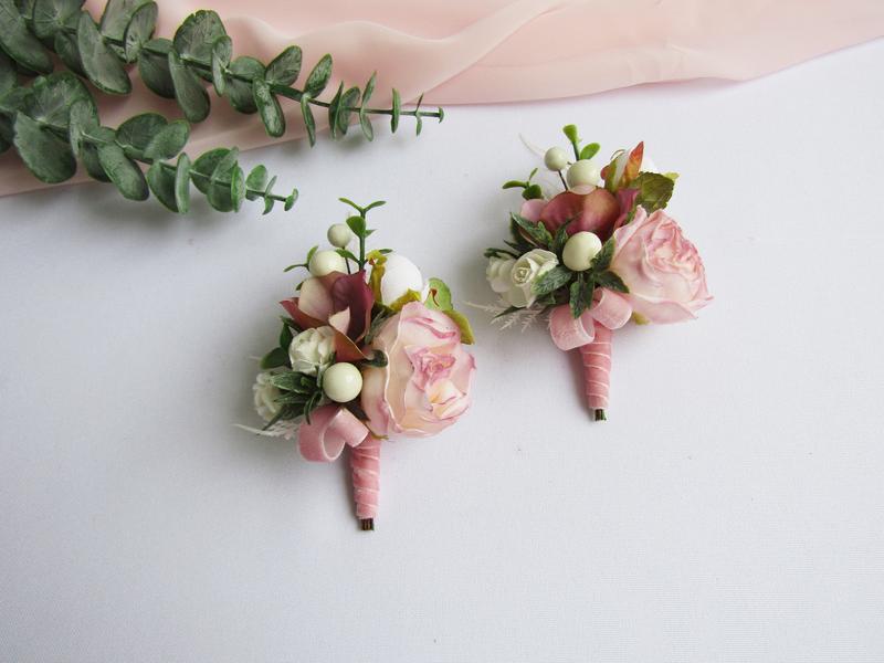 Бутоньерка сделана из зелени, искусственных цветов, крепится на одежду с помощью заколки.