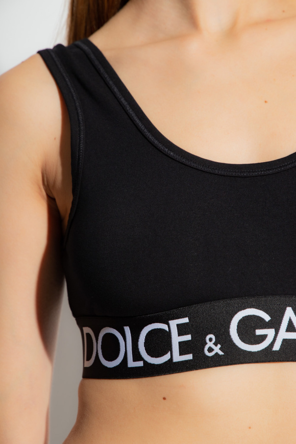 Black cropped tank top from Dolce & Gabbana. Made of cotton, this design features decorative trimming at the round neck and straps as well as an elasticated waist with a white logo embroidery.