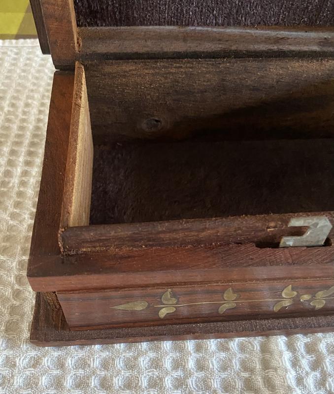Деревянный ящик с инкрустацией металлом желтого цвета. Размер 18 на 13 см, высота 6 см.